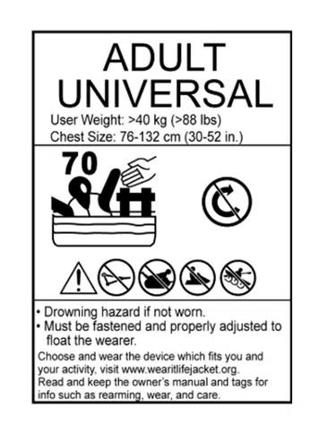 IMPORTANT: Canada has recently harmonized its PFD labeling with international standards, leading to new labels that feature new icons instead of detailed text.  These symbols indicate buoyancy, turning ability and suitability for specific activities (like waterskiing) or use with personal watercraft.